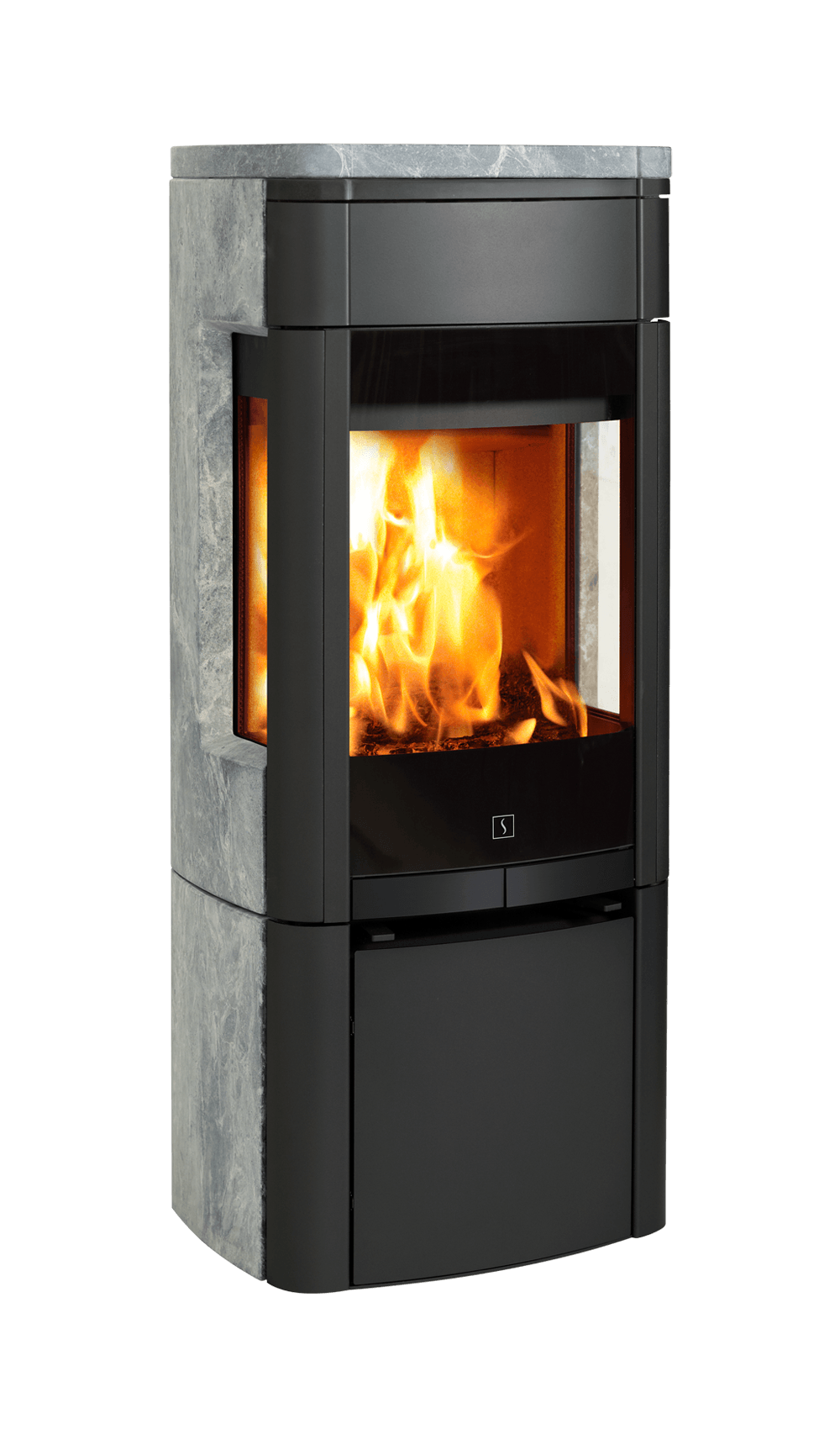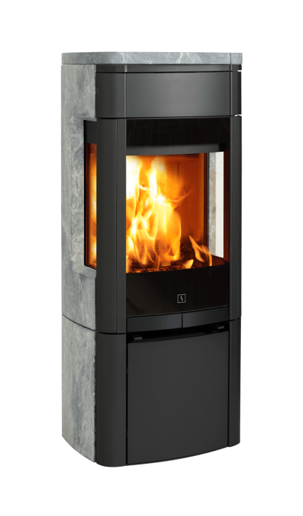 Este modelo está disponible con laterales y placa superior en piedra natural esteatita (soapstone) o arenisca (sandstone). La piedra esteatita es una piedra volcánica de gran densidad e inercia térmica que cumple funciones de acumulador de energía. Este modelo se puede elegir con o sin ventanas laterales. El modelo sin ventanas laterales se puede acercar más a materiales combustibles por el costado. Si le gusta la estufa más elevada, se puede comprar una base de acero que eleva la estufa en 80 mm.