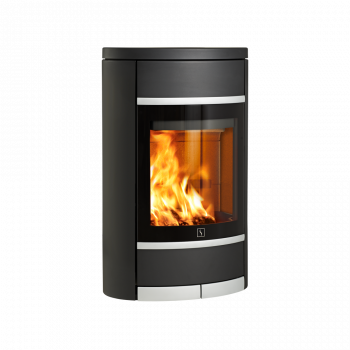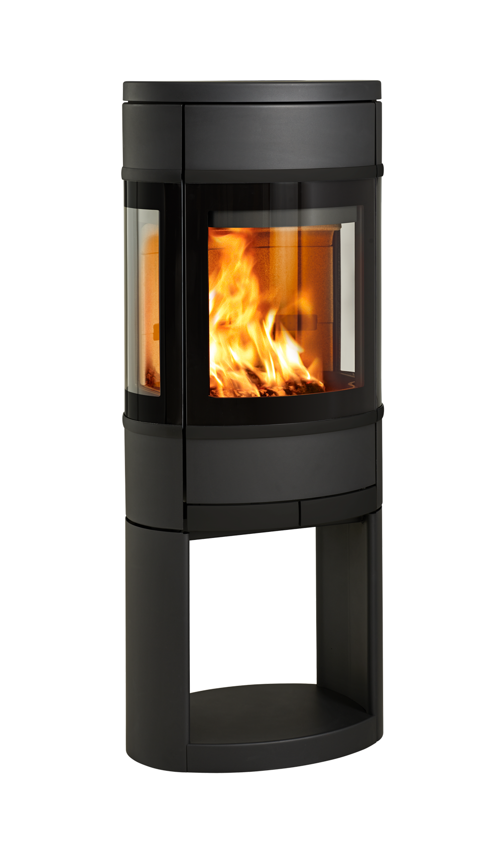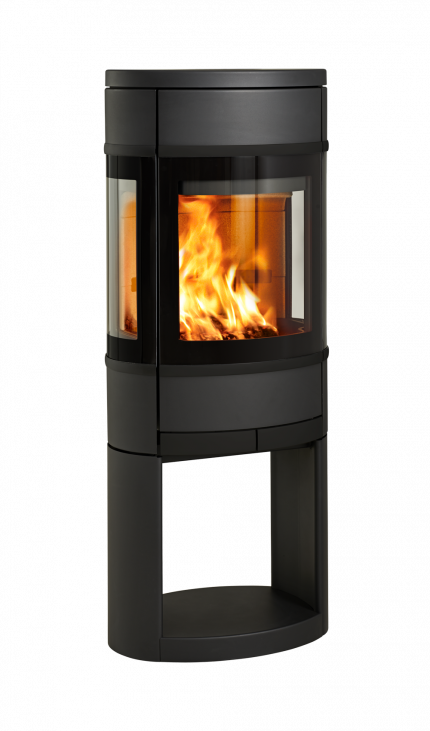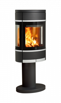 Las grandes ventanas laterales ofrecen una gran visión del fuego. Elija entre molduras y manetas negras o en aluminio. Este modelo está disponible con tres tipos de base: pedestal, portal abierto, o cerrado.