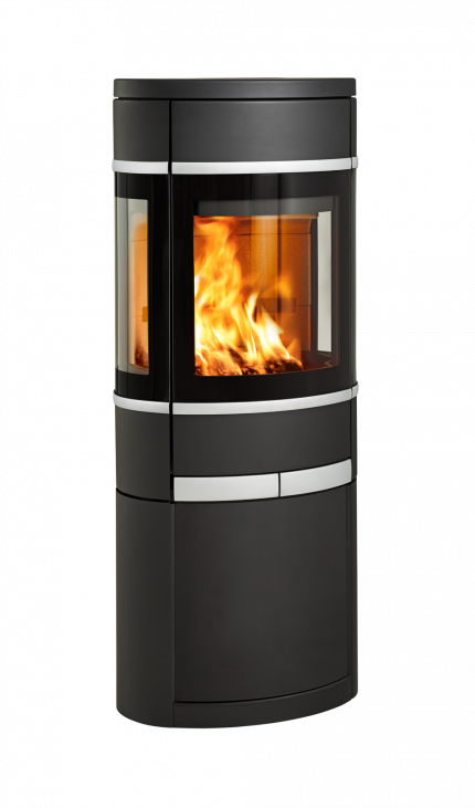 Las grandes ventanas laterales ofrecen una gran visión del fuego. Elija entre molduras y manetas negras o en aluminio. Este modelo está disponible con tres tipos de base: pedestal, portal abierto, o cerrado.