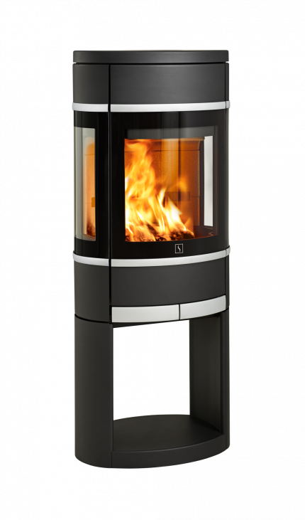 Las grandes ventanas laterales ofrecen una gran visión del fuego. Elija entre molduras y manetas negras o en aluminio. Este modelo está disponible con tres tipos de base: pedestal, portal abierto, o cerrado.