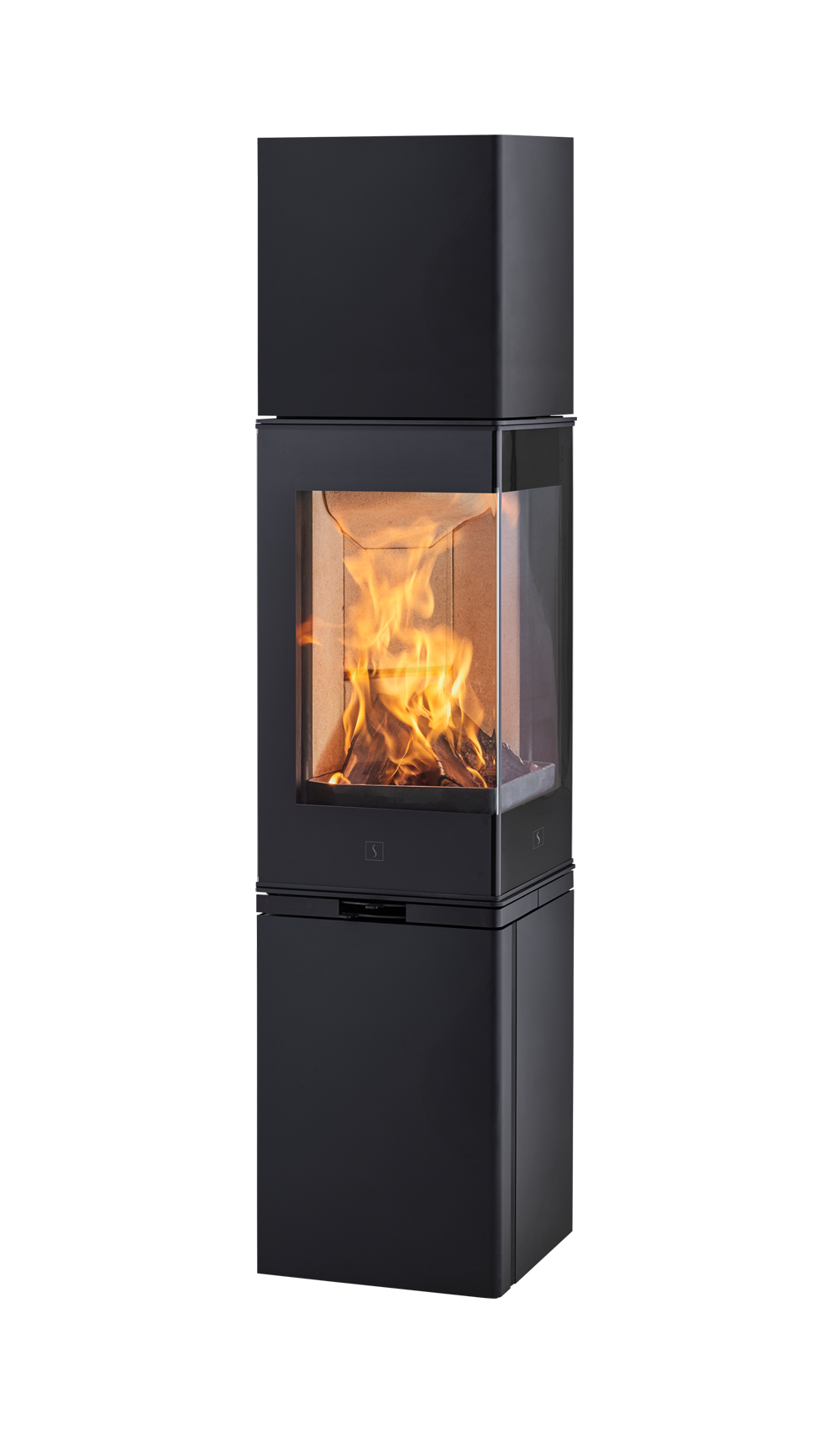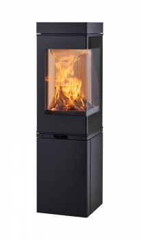 La estufa de leña Scan 80-3 tiene la base cerrada, mientras que el modelo Scan 80-4 tiene una práctica y discreta puerta para almacenamiento en la base. Si la estufa se coloca en una esquina y necesitamos salida semi-lateral en lugar de trasera, existe una versión con high top especial con salida lateral.